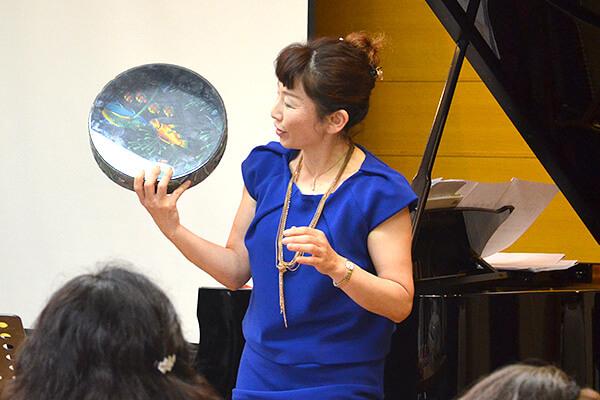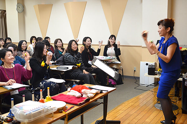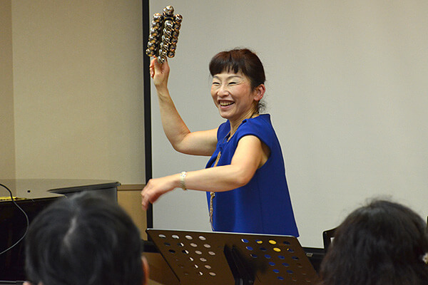 また、それぞれの"プラス1楽器"の奏法も教えていただきながら、皆さん一緒にリズムをとりながら楽しく学びました(受講生の門田裕美さんのお手製シェイカーにも興味深々!)。