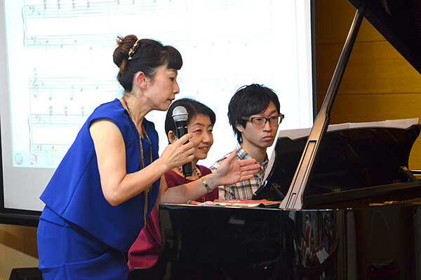 感性が目覚める!7つのピアノレッスン最後に、何か困った際にすぐ役立つ"音の救急箱"と題して、「連弾編」「リズム編」「素材編」のご紹介があり、「感性が目覚める!7つのピアノレッスン」(ドレミ楽譜出版社)の伴奏パーツを、アレンジのヒントとして利用する方法を教えていただきました。
