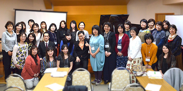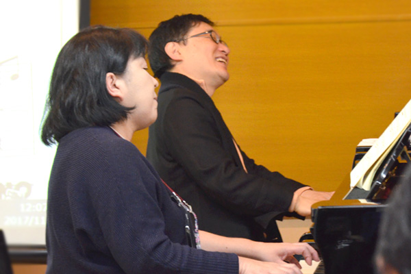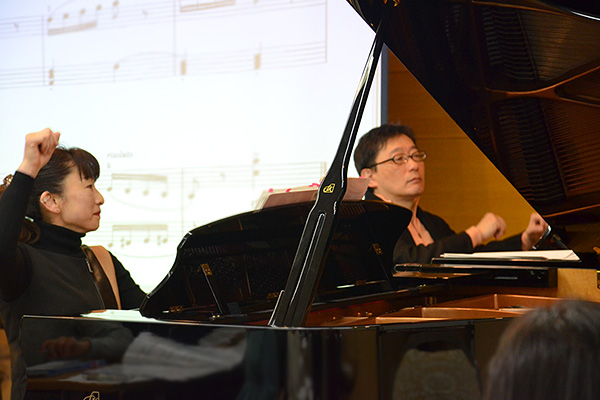 その後、「アラベスクだけで、こんなにあるの!?」と驚くほどの様々なアレンジを、受講者がソロや連弾で次々演奏。最初はおそるおそる演奏している方が殆どでしたが、そこに小原先生のワンポイントアドバイスが入ると、みるみる曲が生き生きと生まれ変わります。次に、なんと即興で!2台ピアノの伴奏を全ての曲に小原先生が入れてくださると、新たな命を吹き込まれたような素晴らしい世界が広がり、会場中が幸せな時間を共有することができました。