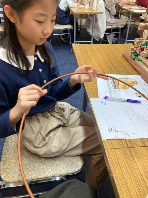 続いて、このピアノの身体検査です。一番低い音を出す弦、真ん中のドの弦、一番高い音を出す弦の長さや太さを子どもと一緒にメジャーで測り、ワークシートにどんどん書き込んでいきます。1つの音につき弦は1本ずつ張られているわけではなく、高音になるにつれ3本になっていくことも、見て確かめました。そして高音を出す鋼鉄の弦と、鋼鉄の周りを銅線で巻いた低音の弦の見本を持たせてもらうと、太さや重さの違いが分かるだけでなく、1本だけでもずっしりとした重みがあることが感じられます。「この弦をピンと張るには、1本あたり80kgの力が必要。だから、君たちが2、3人反対側からぶら下がらないと、張れないわけです。それが230本分、このピアノにかかってくるのです」と話しました。