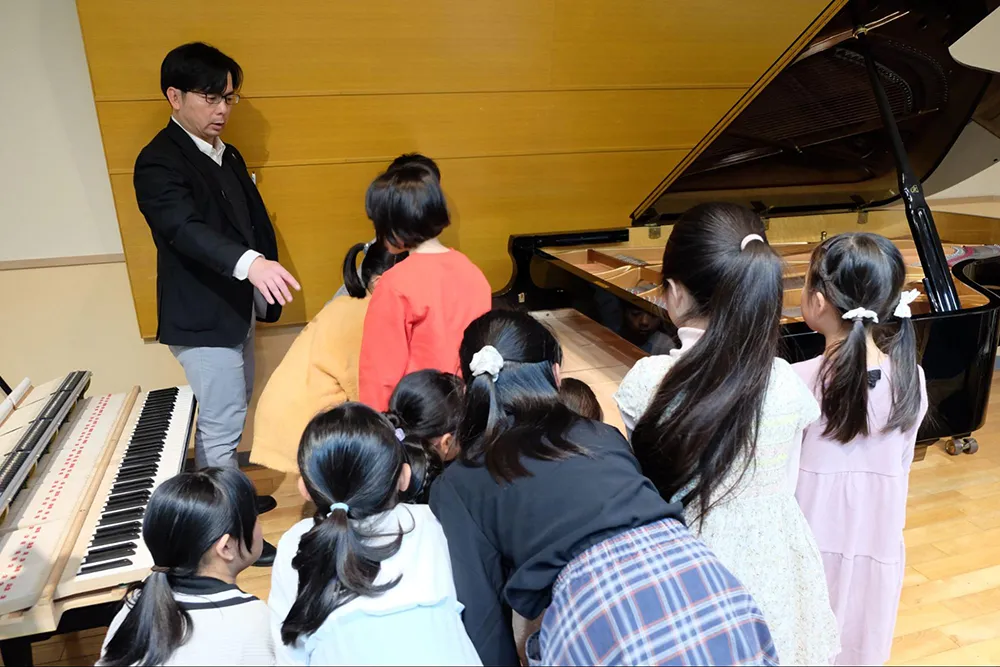 鶴田さんは、何度も子どもたちをピアノの前に呼び、ダンパーのついている場所、形や角度が途中で変わっていること、アクション部分を取り外してハンマーの動く様子や、ペダルを踏んだ時にダンパーが内部で上がっている様子などを、近くで見て確かめさせてくれました。その度に子どもたちは驚きの表情を見せ、どんどん興味をそそられていきました。