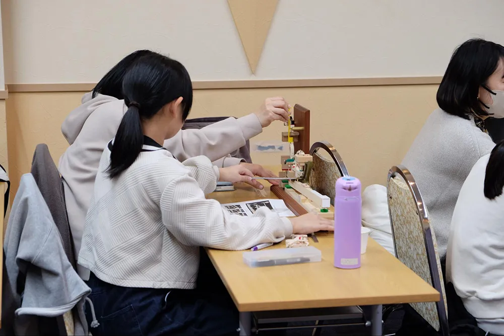 調律師のお仕事の一つである「タッチの調整」も少しだけ体験させてもらいました。1つ目は鍵盤の下に挟まれている紙の枚数を変えることにより、鍵盤の深さを変えること。実際に4枚分変えてみると、確かに押し心地が違います。また、鍵盤やウィペンについているネジを調節することで、ハンマーと弦との打弦距離や、タッチの感覚にかかわる「レットオフ」の加減を変えることもやってみました。アクションモデルの色々な部分に注目しながら鍵盤を何度も押してみることで、鍵盤の重さが、「鍵盤の押しはじめ」、「ダンパーの動きはじめ」、「レットオフから弦を打つまで」と、3段階に変わることも確かめました。