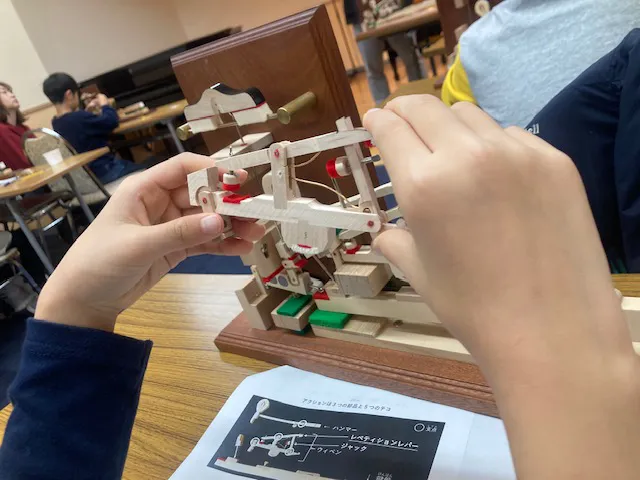 次にアクションモデルを使って鍵盤を押して音を出す仕組みを学びました。「鍵盤を押す」と「ハンマーが上がって弦を打つ」との間にある「ウィペン」(ドイツ語で「シーソー」)の複雑なメカニズムを、手に取って動かしてみながら教えてもらいました。1821年に発明されたこの「ダブルエスケープメント」のおかげで、グランドピアノは1秒間に14回もの連打が可能になったこと、ベートーヴェンが作曲を始めた頃とショパンやリストが作曲を始めた頃とでは、前提となったピアノの能力が違ったのだということも分かりました。