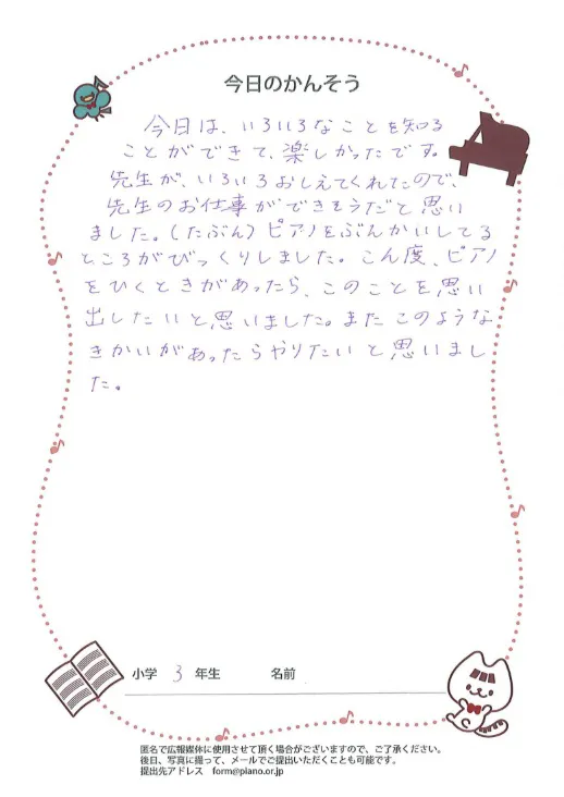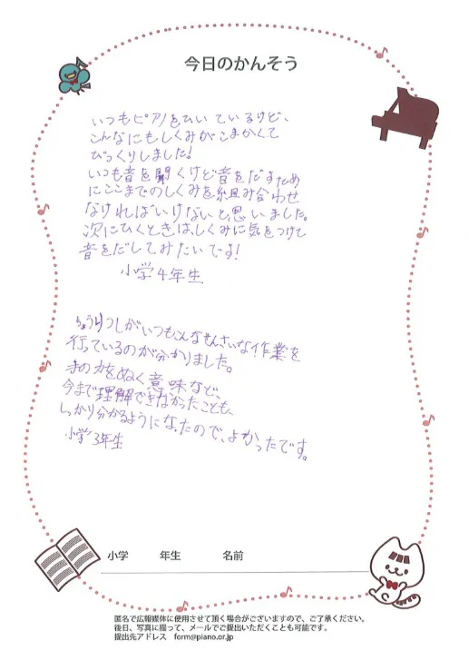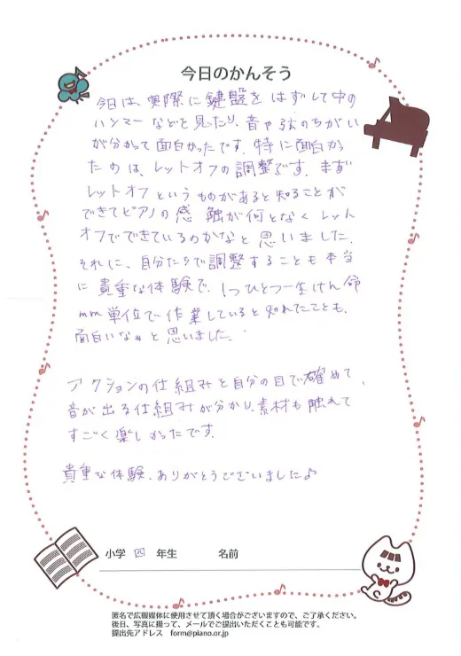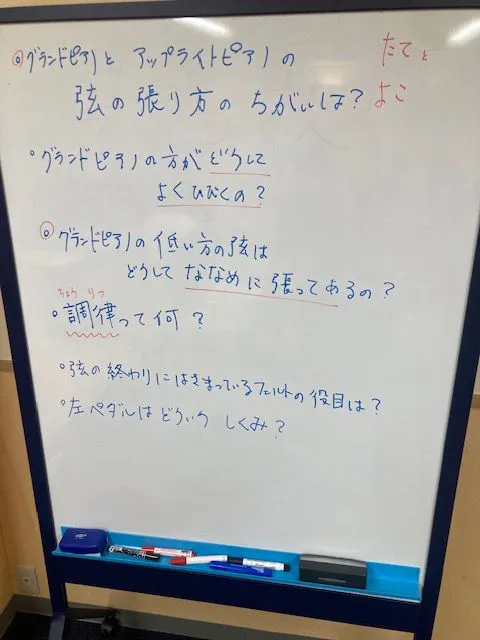 質問ボードの写真ピアノを習っている子たちは、知識としては知っている子、グランドピアノの中をのぞいたことがある子はいても、楽器の中の見えない部分で何がどう動いているのかまではなかなか実際に見て確かめることはできません。今回はさらに、自分たちでやってみることで、その細かい違いが変わると音やタッチにどのくらい影響があるのか、というところまでを体感することができ、とても貴重な機会となりました。