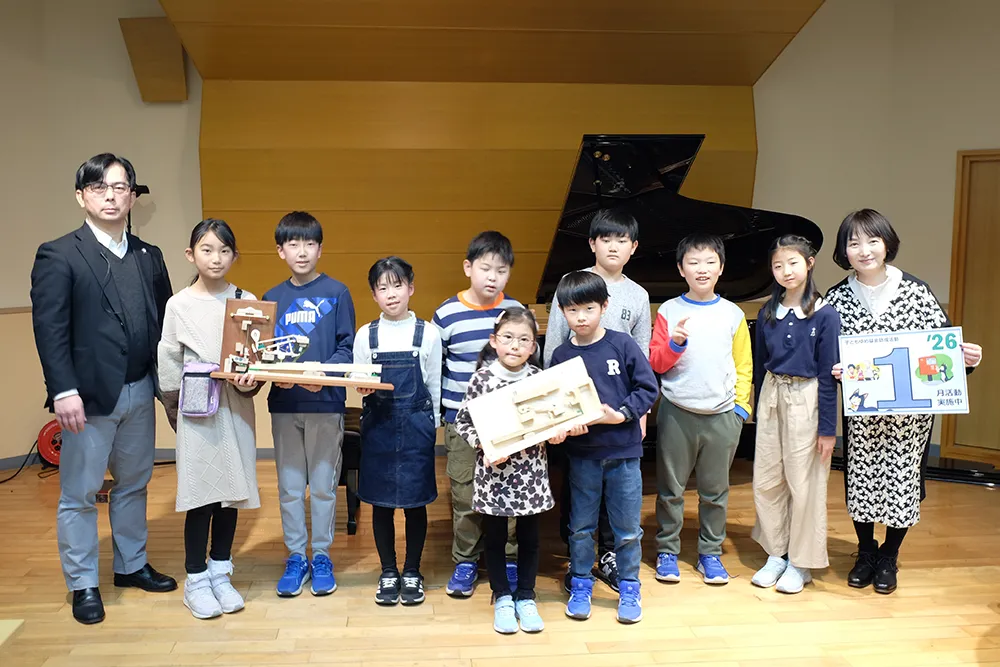 最後には子どもたちからの質問もたくさん集まりました。「グランドピアノとアップライトピアノの弦の張り方の違いは?」「グランドピアノの低い方の弦はどうして斜めに張ってあるの?」「低い弦の反対側に挟まっているフェルトの役目は?」「グランドピアノの方がどうしてよく響くの?」など様々な質問に、実物を見せながら丁寧に教えてくださいました。「調律って?」という質問には、1つの音に張ってある3本の弦のうち1つだけを緩めて、3本の弦の音の高さが揃わないと気持ちが悪い、ということを体感させてくれました。