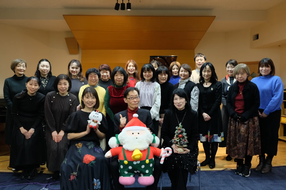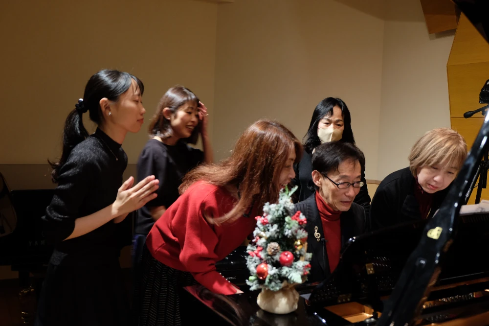 ミニコンサートでは、まずはクリスマスらしく、轟先生アレンジの讃美歌を連弾。続く《ホワイト・クリスマス》では、お二方のアレンジ聴き比べ。そして、小原先生のアレンジ《アヴェ・マリア》と、しっとりとした演奏が続き会場はうっとり~。その後のアンコールでは、《オー・ホーリー・ナイト》(連弾)をまず演奏。ラストの《ジングル・ベル》では、会場参加者は鈴やタンバリン、手拍子を入れながら、急きょ小原先生のピアノ(伴奏)でリレー連弾もできることになり、大盛り上がり!皆さんニコニコ顔で満足感を味わえた、充実したワークショップの締めくくりとなりました。